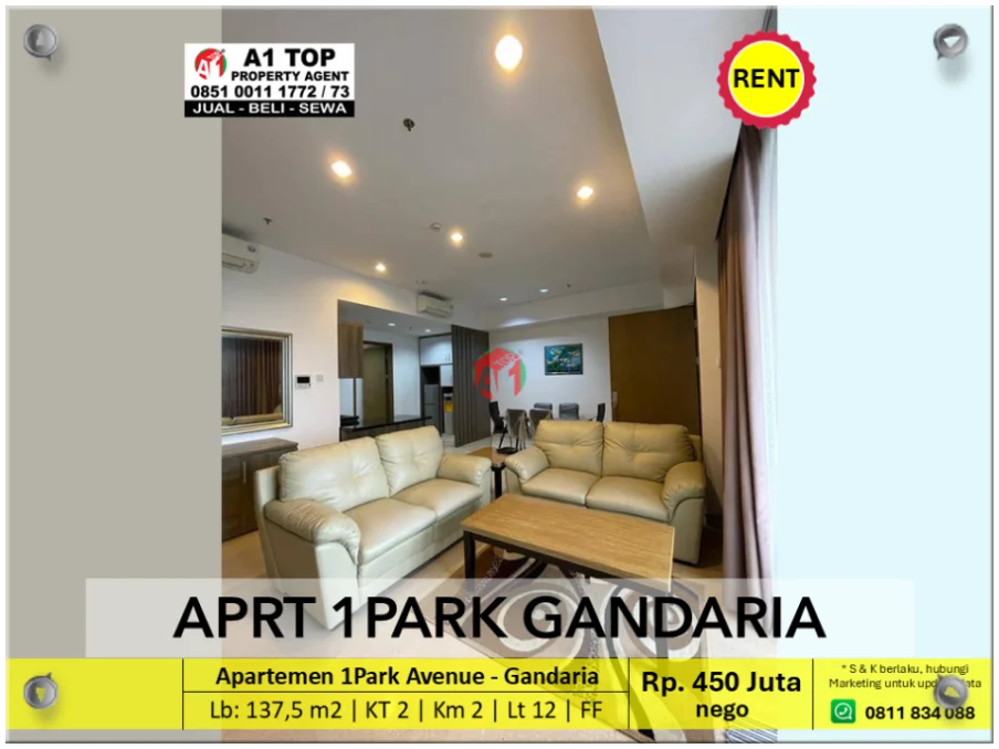 1Park Avenue Apartemen Gandaria, harga Rp. 450 juta/tahun (nego)