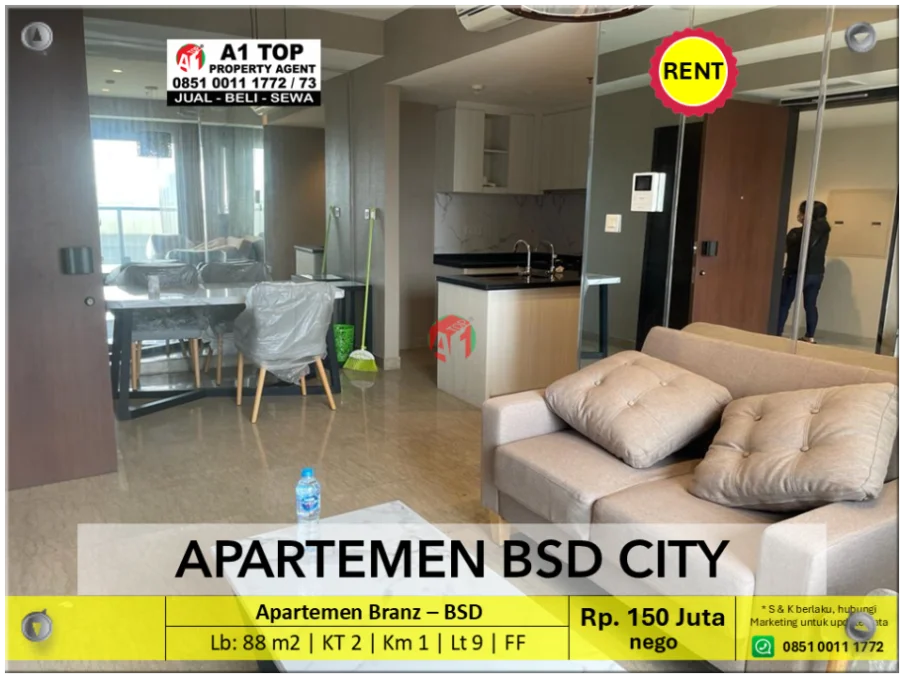 Apartemen Branz lokasinya berdekatan dengan MALL AEON BSD dan serta berada di CBD BSD, Fasilitas kolam renang indor dan outdor, Air kran sudah dapat langsung minum jadi hemat sehingga tidak direpotkan dengan mengangkat air mineral galon, tersedia mesin cuci, microwave dan lemari es.