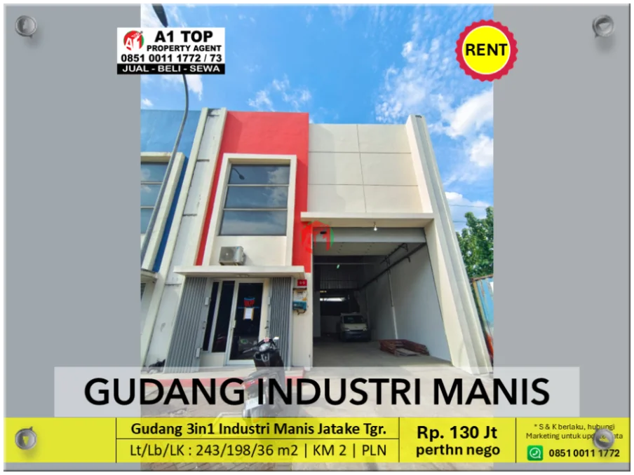 Gudang 3 ini 1 Kawasan Industri Manis, harga Rp. 130 juta/tahun (nego)