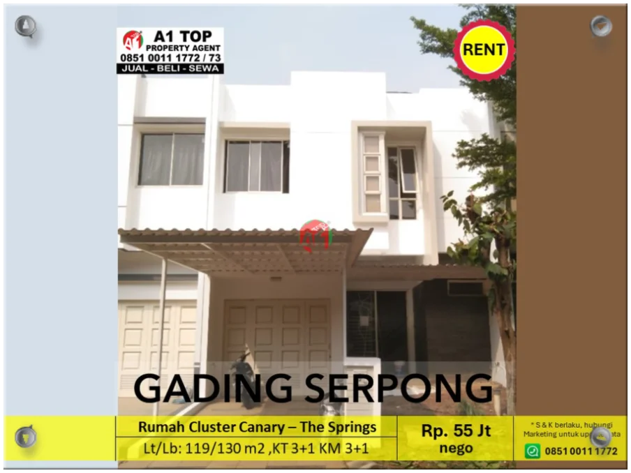 Rumah Cluster Canary The Springs, harga Rp. 55 juta /tahun (nego)