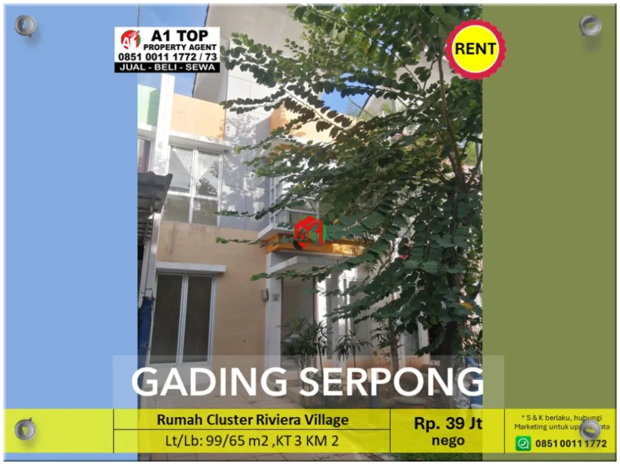 Rumah Cluster Riviera Village, harga Rp. 39 juta/tahun (nego)